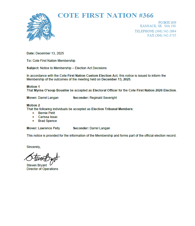 Notice to Cote First Nation Membership – Electoral Officer & Tribunal Members