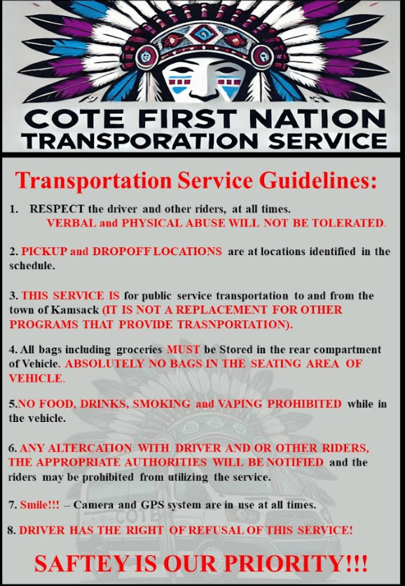 • Shuttle Schedule: Approximately four (4) shuttles daily, traveling between Cote and Kamsack. Designated pick-up and drop-off locations have been established for the convenience of community members.